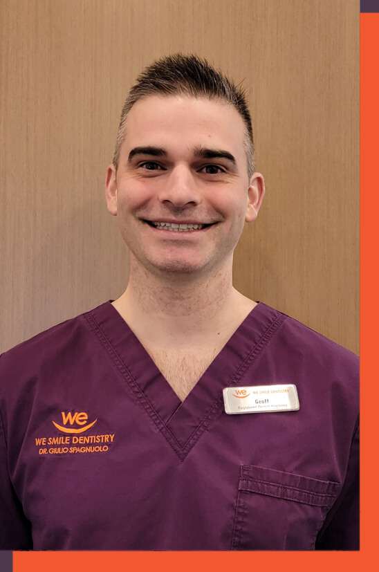 Hi, my name is Geoff, and I’m a Registered Dental Hygienist. I achieved an Advanced Diploma in Dental Hygiene at Fanshawe College prior to joining Dr. Spagnuolo’s team in 2021. I previously worked as a Chef for 15 years with international experience. I still enjoy cooking, as well as spending time outdoors with my wife and two children. I believe that good oral health is an essential component of overall health, and I look forward to helping you achieve your oral health goals.